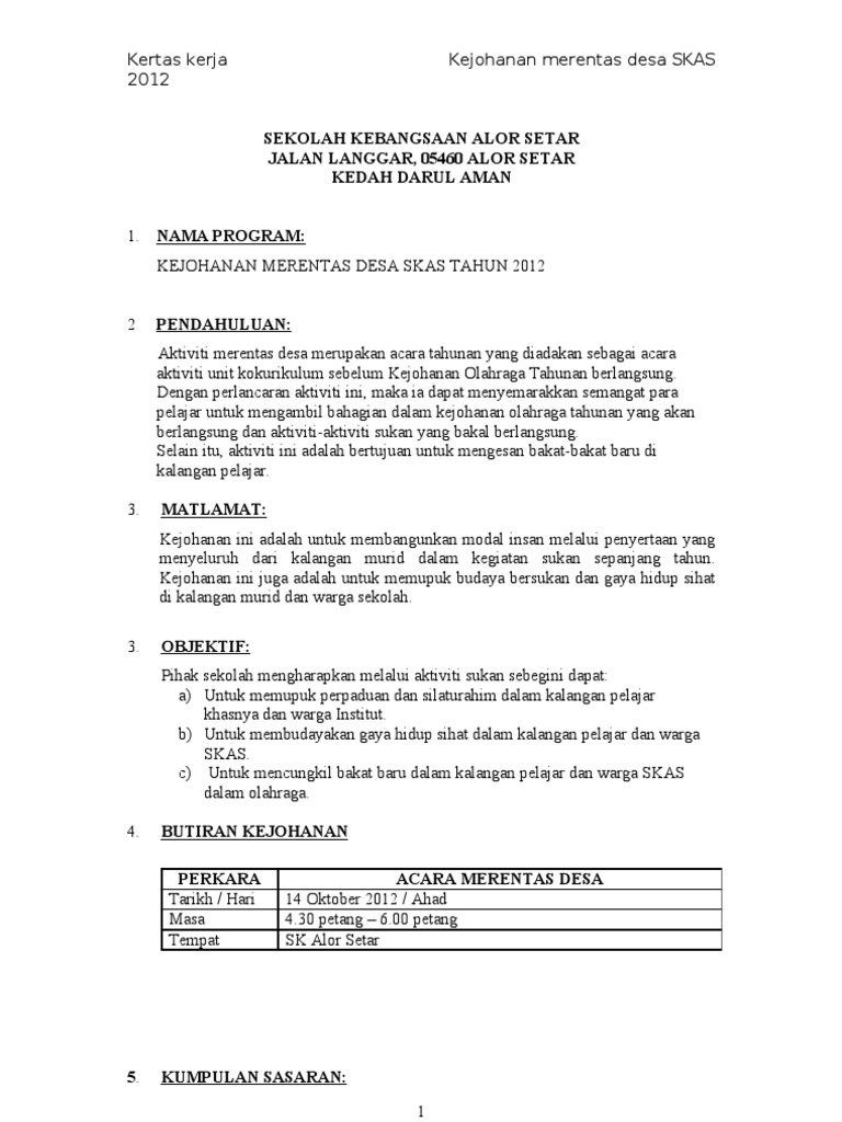 . PENDAHULUAN Merentas Desa merupakan satu acara tahunan sekolahdi sekolah menengah malahan merupakan sukan yang amat mudah dan boleh disertai oleh semua pelajar. Kertas kerja kejohanan merentas desa kali ke 9 by zubaidah - issuu. Pendahuluan Program Merentas Desa Sekolah Rendah Peringkat Daerah Kota Belud bertujuan untuk menanamkan semangat cinta kepada badan yang sihat melalui aktiviti sukan.